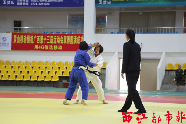 ????11月9日,在第二天的柔道比賽中,河池市選手(白方)與北海市選手(藍方)展開對決。當天的比賽共產生了四枚金牌,分別是女子甲組50公斤級、女子甲組53公斤級、女子乙組47公斤級、女子乙組50公斤級的比賽。其中,女子甲組50公斤級金牌由賀州市獲得,女子甲組53公斤級金牌由南寧市獲得,女子乙組47公斤級金牌由河池市獲得,女子乙組50公斤級金牌由百色市獲得。 (吳艷虹 關新 攝影報道)