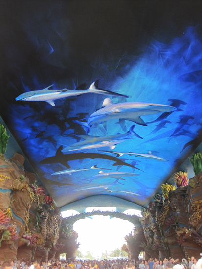 ????天幕位于游樂場正門處的海洋大街,是一塊67米長、24米寬,總面積達1608平方米的巨型LED電子屏。天幕上呈現(xiàn)的是深海里各種魚類與生物的模擬景象,游客們從大街走過時,一抬頭就能看到。一蹦而起的八爪魚在你頭頂呼嘯飛過,可愛雪白的海豚在色彩斑斕的魚群中穿梭,無數(shù)的水泡不時地在畫面上飄浮,屏幕上變幻的畫面令人嘆為觀止。