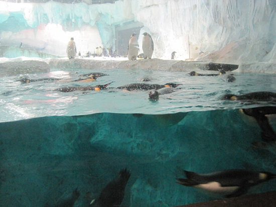 ????有一種企鵝眼睛上面長著白白的毛,忽閃忽閃的樣子更是滑稽。最值得一看的是企鵝展區(qū)內(nèi)的水底觀景穹頂隧道,可以看到企鵝們矯健的泳姿。一群企鵝游過來,又一群企鵝游過去,無數(shù)白花花的橢圓形的肚皮在你的頭頂上飄過,場景十分壯觀。據(jù)工作人員介紹,這里擁有5個品種、超過200只企鵝,可能是世界上擁有企鵝數(shù)量最多的企鵝展區(qū)。