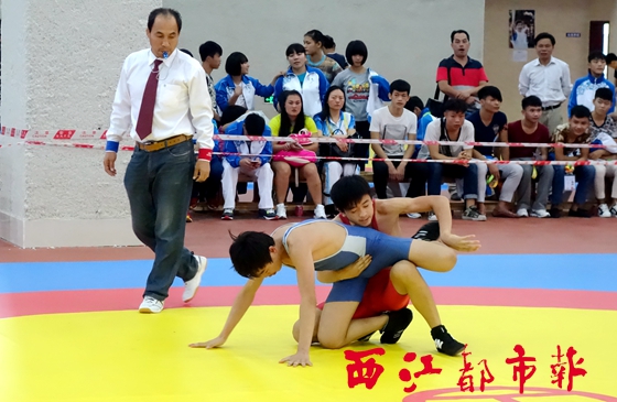 ????當天多次決賽中,最精彩的要數男子乙組48公斤自由式決賽。由賀州選手劉龍飛迎戰北海耿興和。起初,劉龍飛一直處于下風,而轉折點就出現在比賽的第二回合。當時,劉龍飛抓住對手腳步不穩的一個漏洞,先是繞后腰抱腿,奪下關鍵兩分后,又迅速實施一個側抱腿,兩個技術動作完成下來,讓原本落后的劉龍飛一下子就反超對手4分。最終,劉龍飛如愿地拿到該級別的金牌。