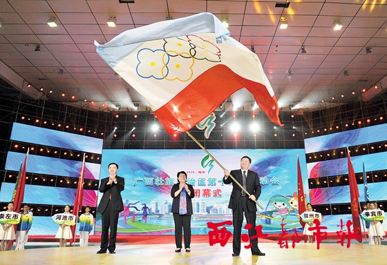 ????榮仕星宣布百色市為廣西第十四屆運動會承辦城市。會旗交接儀式上,李康接過梧州市委常委、宣傳部部長、副市長、組委會委員黃振饒遞交的區運會會旗,并傳遞給廣西第十四屆運動會承辦城市百色市市委常委、宣傳部部長、副市長黃建寧。