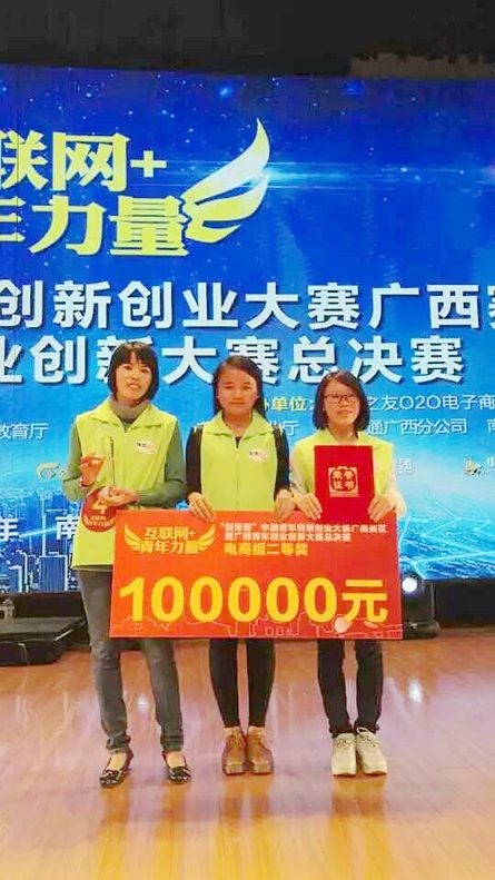 在“創青春”中國青年創新創業大賽廣西賽區暨2015廣西青年創業創新大賽總決賽中,吳春清(左一)所在的電商組獲得了二等獎和“最具投資價值青年創業獎”。 (圖片由受訪者提供)?