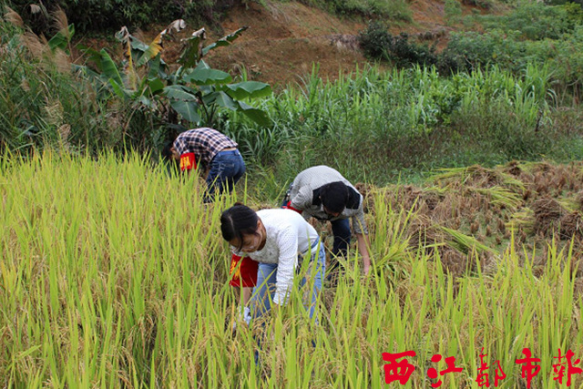 ????當天下午天氣一放晴,十多名青年志愿服務者馬上來到黃繼棠家的稻田里,割禾、脫粒、打包背運,不到半天的時間,三畝多的稻田就已經收割完畢。