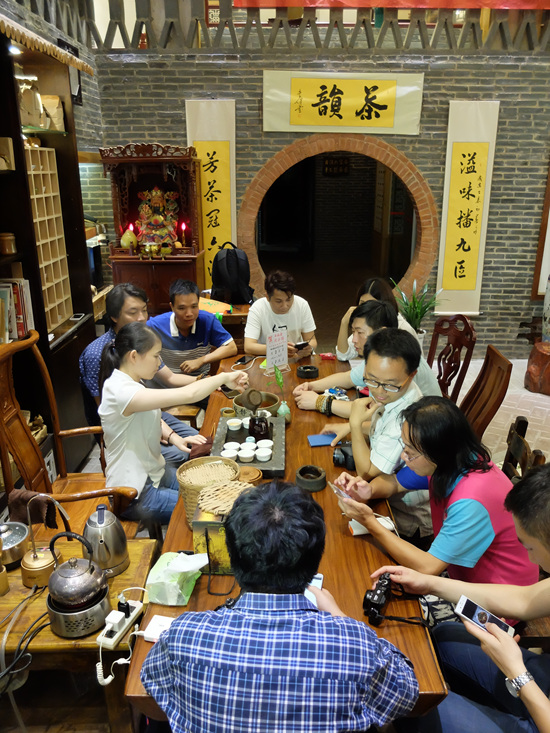 旅游達人們觀看六堡茶茶藝表演,六堡茶香氣醇陳令他們贊不絕口。