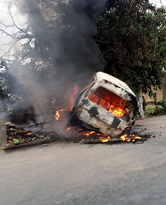??? 11月29日,一輛微型面包車行至324國道岑溪市歸義鎮路段時突然起火燃燒,幸未造成人員傷亡。