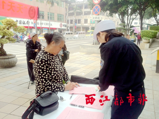 ????上午9時30分,在萬秀區(qū)中山崗亭對出的十字路口處,由梧州市交警支隊開展的“全國交通安全日”系列活動開始舉行。人行道旁掛著“天天122 天天文明行”的橫幅,不少過往的市民上前簽名承諾表示支持;十字路口的四條人行道旁,均放置著提醒市民文明出行的告示牌,路口處站著多位交通勸導員引導群眾安全過馬路;文化路小學少年警校的學生將一份份倡導文明出行的傳單分發(fā)到市民手中。