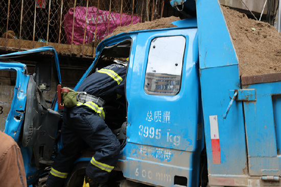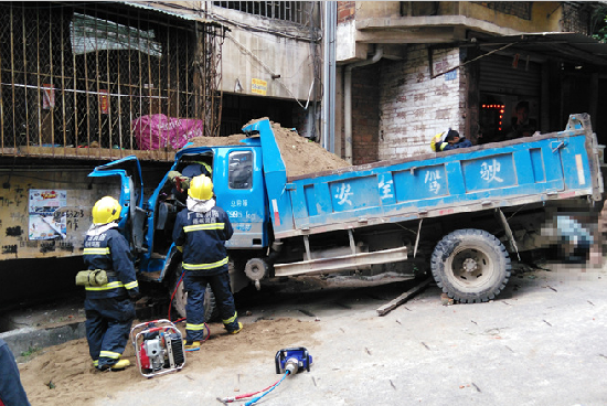????在事故現場,記者看到包括消防人員、醫護人員在內的多名救援人員,正在對小男孩展開積極的救援。由于駕駛室已變形,消防人員只能一人進入駕駛室,其他人員采用液壓剪、擴張器等工具進行救援。
