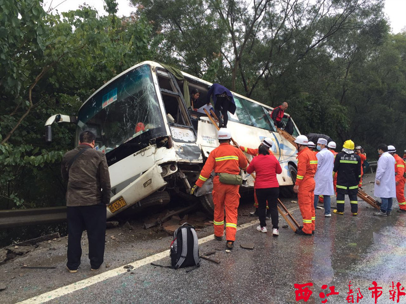????12月9日10時37分,在S304國道藤縣富吉路段,一輛由桂平開往梧州的客車為避讓對面開來的水泥罐車,撞向路邊護欄,車上16名乘客被困。