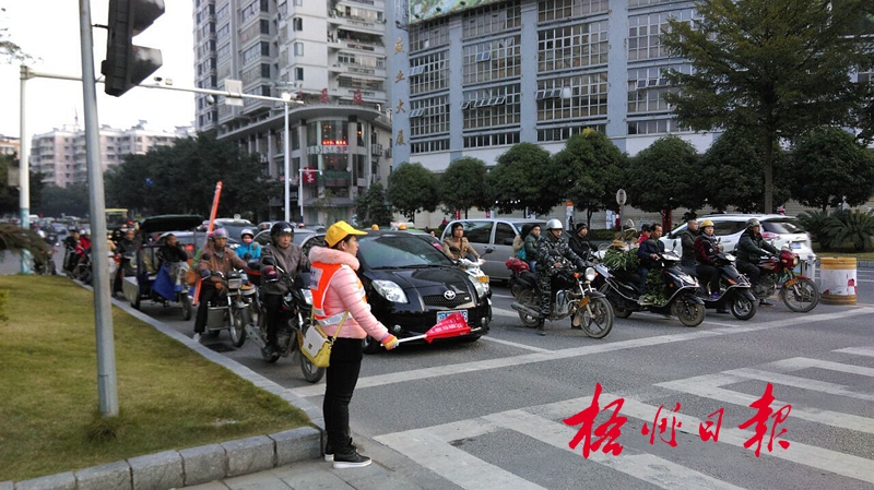 12月16日,在新興二路原夢之島時代廣場路口,長洲區文明交通志愿勸導員正配合交警維護交通秩序。梁少歡 陳平平 攝