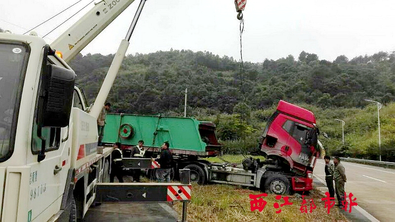 ????當日凌晨5時30分,梧州市交警支隊高速一、二整合大隊值班民警接到警情:在G65包茂高速P2744KM+600M飛田隧道附近,一輛大型掛車從中央隔離護欄處掉頭,因場地位置不夠,車頭的車輪被卡入泥地內,動彈不得。
