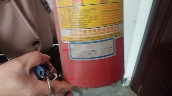 樓道設(shè)置的滅火器陳舊不堪,上面標(biāo)明的檢驗(yàn)日期為2011年1月7日。?紀(jì)榮蘭/攝