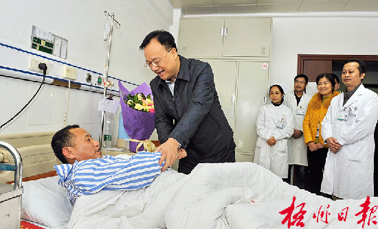 ????12月24日下午,市委書記黃俊華到醫院,看望慰問在抓捕涉毒犯罪嫌疑人行動中英勇負傷的禁毒民警老魏,關切地詢問他的傷勢,叮囑他安心養傷,爭取早日康復。 孟亞西 攝