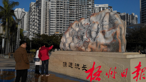 12月25日,在國龍大酒店對出河堤綠地,市民正參觀海陸絲綢之路最早對接點之梧州碑銘。李欣鞠 攝