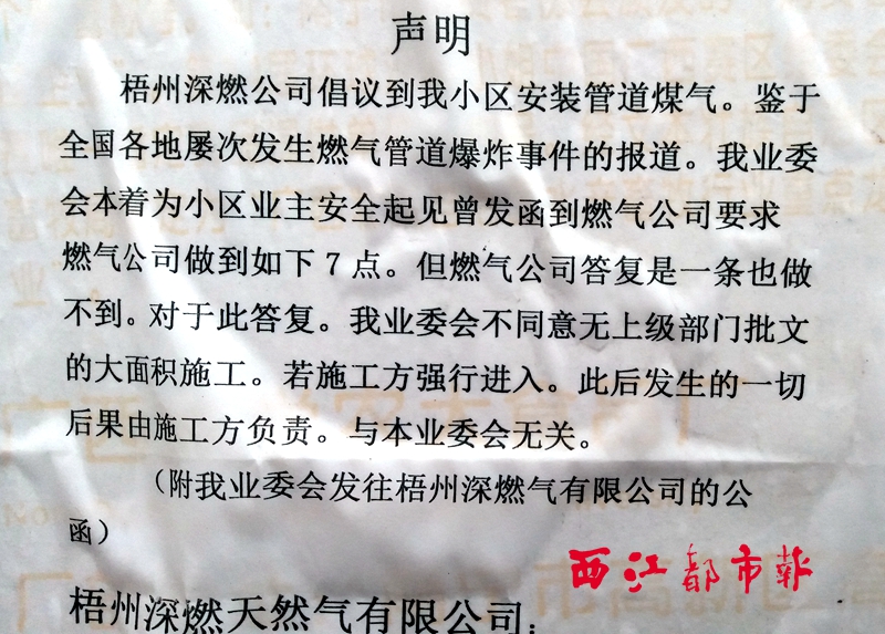 ????12月24日,在豐業(yè)新苑小區(qū)的公告欄處,記者看到了落款為“豐業(yè)新苑業(yè)委會第三屆籌備小組”的幾張文字資料,此外還有梧州市市政和園林管理局、梧州市物業(yè)管理協(xié)會共同發(fā)出的關(guān)于普及小區(qū)用戶使用天然氣的倡議書。其中有一份情況說明書是這樣寫的:梧州深燃天然氣有限公司準(zhǔn)備進(jìn)場,開挖線路和各項目工程,如出現(xiàn)安全問題,必須由深燃公司全部負(fù)責(zé),與業(yè)委會無關(guān)系。還有一份聲明稱,鑒于全國各地屢次發(fā)生燃?xì)夤艿辣ㄊ录瑸榱诵^(qū)業(yè)主安全起見,列出其中七條相關(guān)要求要深燃公司做到,否則小區(qū)業(yè)委會不同意無批文的大面積施工。