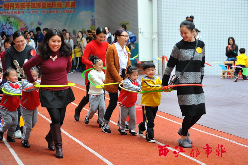 ????當日,梧州市一幼玥城實驗園舉行迎新年親子健身活動,眾多家長來到幼兒園和自己的孩子一起參與游戲,在鍛煉中迎接新年的到來。
