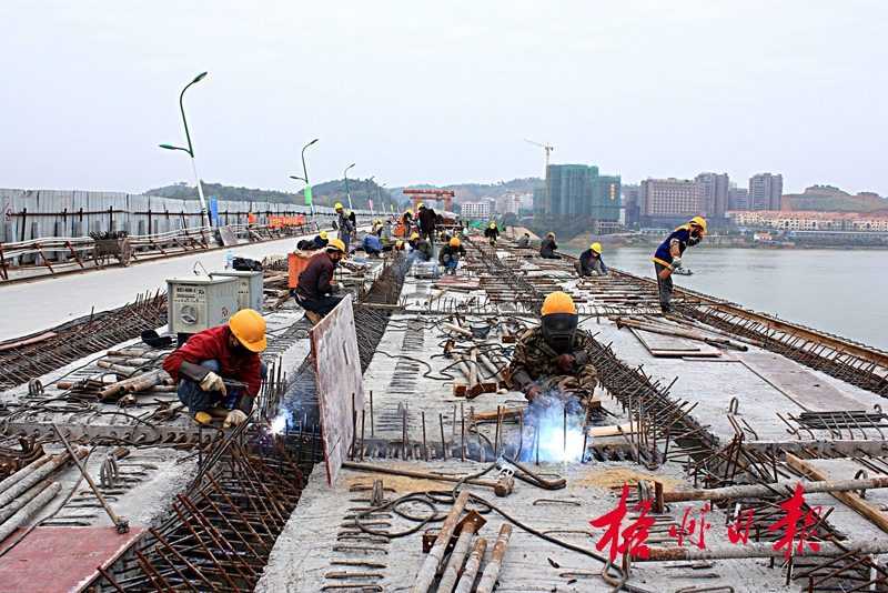 ??? 12月28日,在藤縣西江大橋,工人們正進行焊接鋼筋、架設預制梁等施工作業。