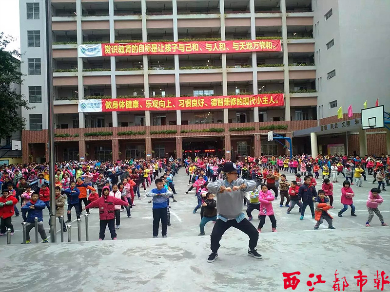 ????近一個月來,每到大課間操時間,在梧州市工廠路小學操場中央,穿著統一校服的學生們,跟著充滿節奏和動感的Hip hop音樂盡情揮舞,扭動身姿,動作整齊劃一……