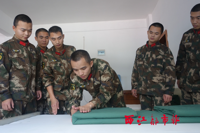 在寢室里,李華鑫(左四)在班長的指導下演示內務整理。