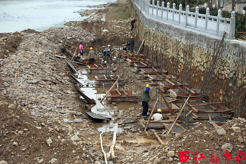 ????1月11日 ,工人在蒙山縣湄江河沿岸建設觀景臺。