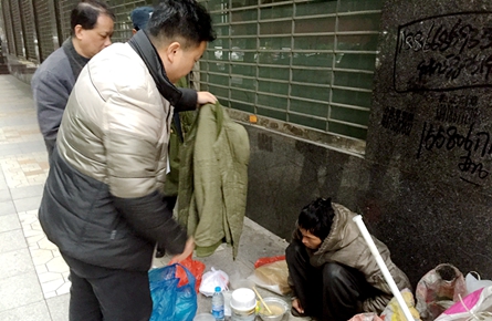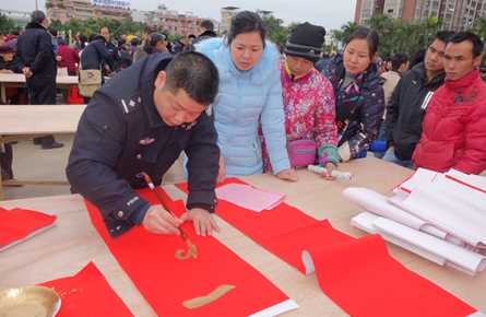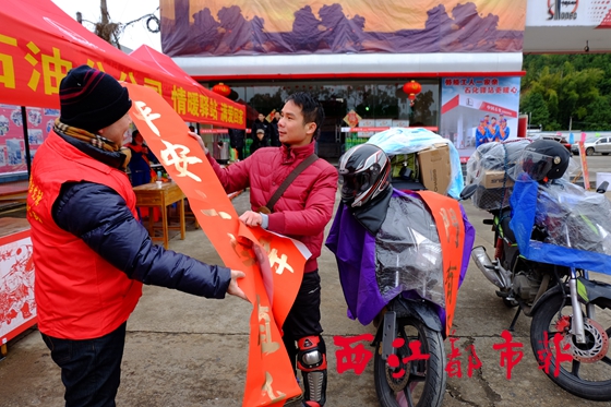 ?1月24日,在東出口春運服務站,來自梧州市文聯的黨員志愿者為過路摩托車司機送上手寫春聯。 本報記者 何鎏/攝
