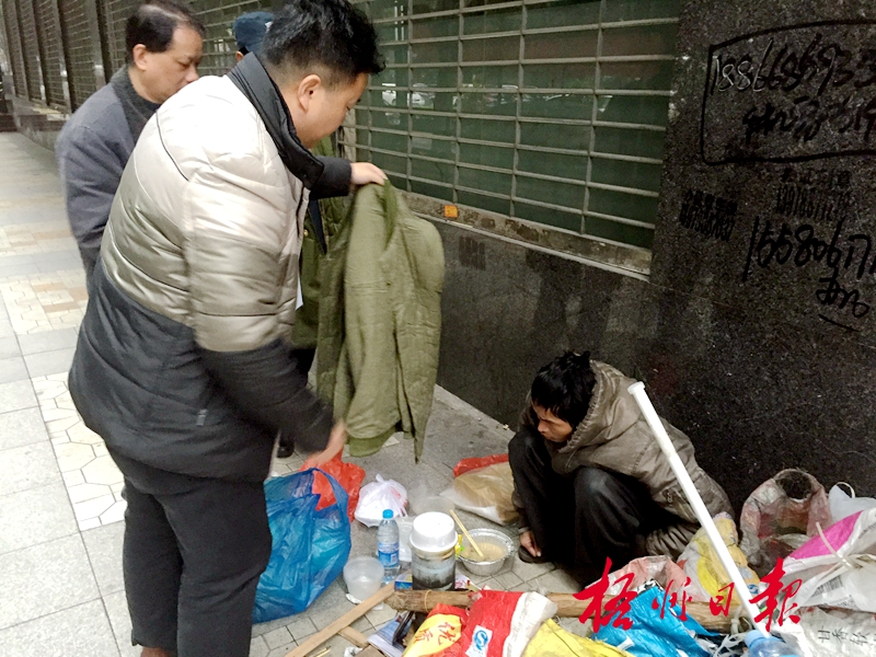 ????近來“霸王級”寒潮天氣的到來,給街頭流浪乞討、生活無著人員生命安全帶來了嚴重威脅,為確保他們安全度過此次惡劣天氣,市救助管理站救助人員每日“三巡”,加大救助保護力度,帶著救助物資沿街、沿路開展巡查搜救行動。在新興路,一名年輕的拾荒男子正在燒火煮東西,身旁堆放著近十個裝有塑料瓶、紙片、廢舊衣物的蛇皮袋。“你受凍嗎,要不要跟我們回救助站?”在工作人員耐心詢問的同時,該男子仍旁若無人地吃東西。無奈,工作人員只好將幾包方便面、八寶粥、水等放在一旁,并送上御寒棉衣,叮囑他注意身體。