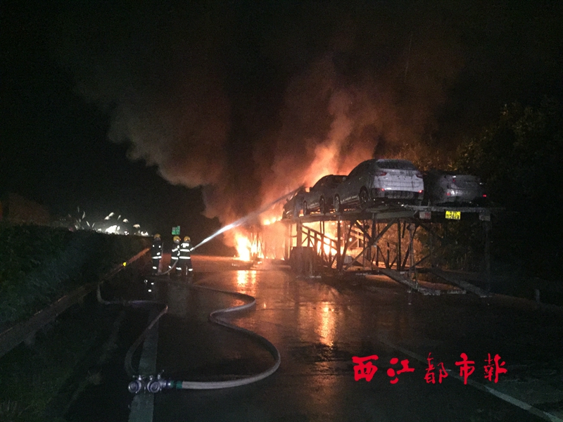??? 西江都市報訊(記者 楊珊 通訊員 夏逸 蘇延炎)1月25日20時許,一輛運載著20輛小汽車的重型半掛牽引車在廣昆高速岑溪馬路收費站附近發生自燃。事發后,該車司機與消防人員從車上緊急轉移部分小汽車,但仍有13輛全新小汽車被大火燒毀。