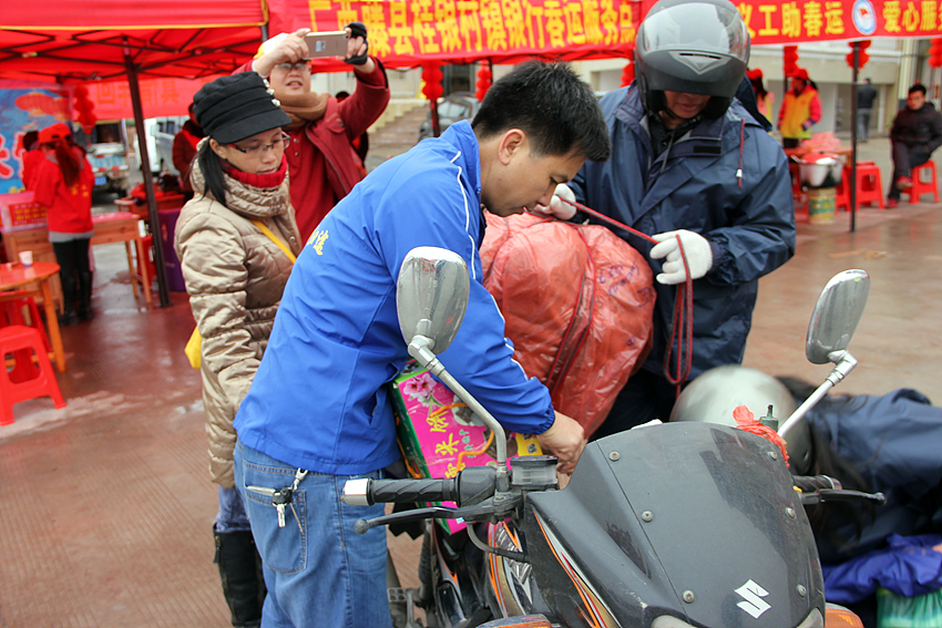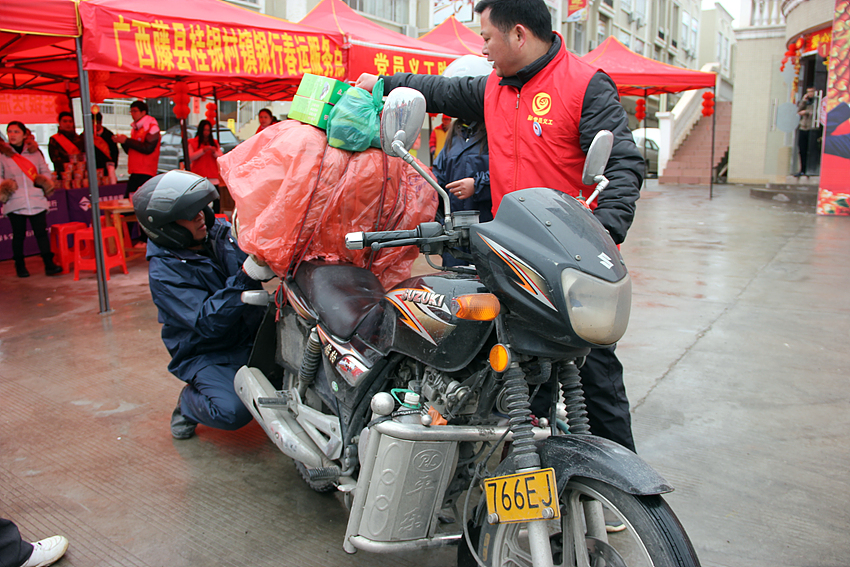 2016年1月24日上午10時左右,廣西梧州藤縣春運服務站迎來了第一輛返鄉摩托,騎乘這輛摩托車返鄉的是南寧上林縣的黃錦龍夫婦。在服務站里等著的,都是與黃先生夫婦約定“不見不散”的交警和網友志愿者。