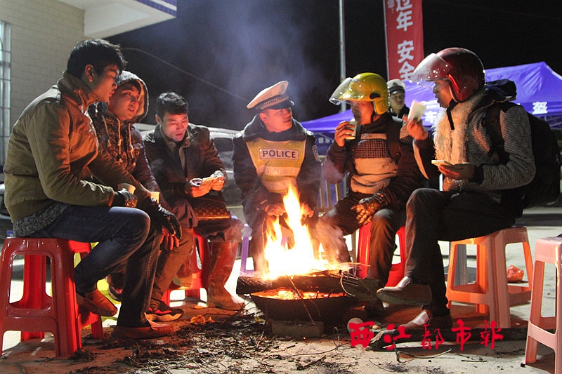 1月26日晚,過境返鄉(xiāng)民工在岑溪市春運服務(wù)站內(nèi)烤火取暖。岑溪大隊供圖