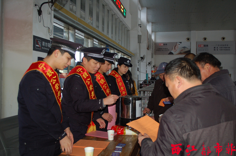 當天,梧州鐵路警方在梧州火車站候車室設置寧鐵公安青年志愿者便民服務臺,根據旅客群眾需要,為他們免費提供熱姜糖水、縫衣針線盒、列車時刻表等便民項目。此外,民警還將印有法律常識、安全提示的宣傳單及警民聯系卡送到群眾手中,并以通俗易懂的語言、舉例說明的方式為群眾耐心做好解釋。