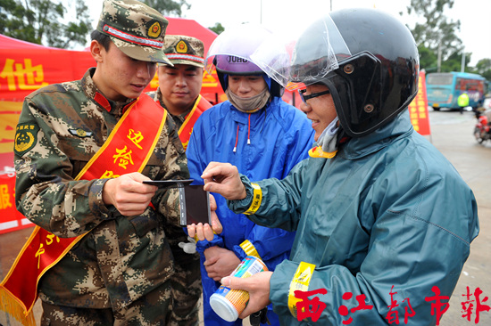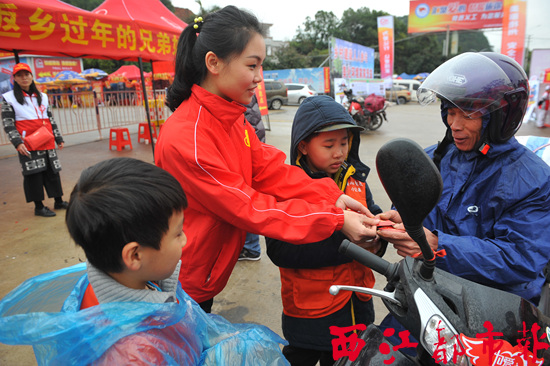 ????1月29日,西江都市報攜手廣西梧州茂圣茶業有限公司舉辦的“讓愛回家”公益活動,在梧州市東出口春運服務站如期進行。當天,十名梧州日報社優秀小記者代表成為“春運服務志愿者”,與梧州邊防檢查站的武警官兵一起,為路過的返鄉旅客送去溫暖和祝福。