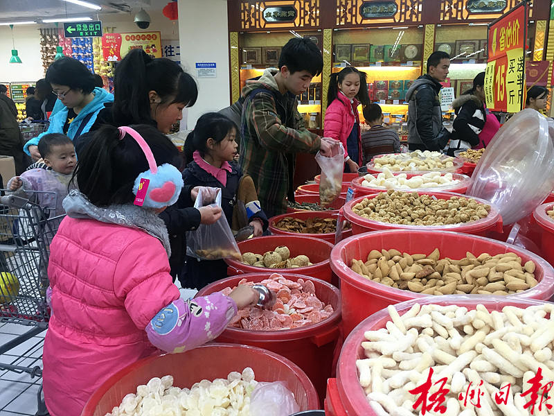 ??? 春節(jié)臨近,各大超市紛紛拋出降價(jià)、打折、團(tuán)購(gòu)等優(yōu)惠,分門別類上架各種應(yīng)節(jié)商品,吸引了不少市民購(gòu)買,以年貨銷售為主的消費(fèi)熱潮日漸紅火。 楊苑君 攝