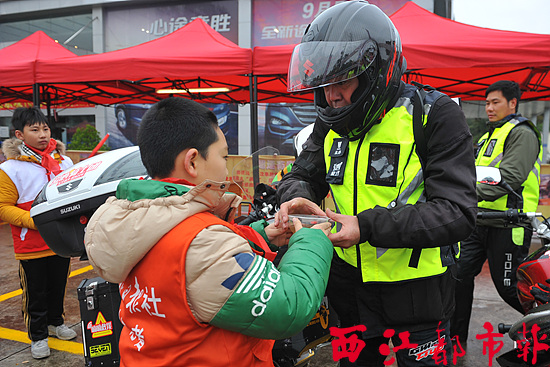 小記者為服務(wù)春運的愛心騎士團(tuán)成員遞上姜茶。