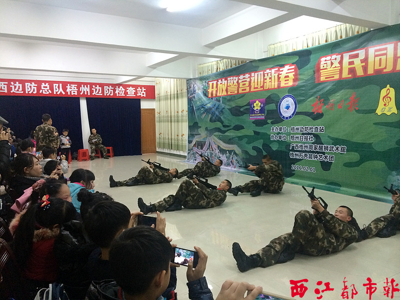 ????為拉近官兵與駐地群眾的聯(lián)系,當日還舉辦了警民迎新春文藝聯(lián)歡會。本次文藝聯(lián)歡得到了梧州邊檢站的大力支持,還邀請到晨鐘藝術(shù)團一同表演。“開放警營迎新春,警民同樂話和諧”的文藝聯(lián)歡,涵蓋了歌曲、舞蹈、魔術(shù)、武術(shù)等各種表演形式。軍術(shù)表演《匕首操》《特種戰(zhàn)術(shù)表演》展現(xiàn)了官兵日常生活和過硬的軍事素質(zhì),小記者學員們也由此“才思泉涌”,紛紛用各種形容詞為他們點贊。“很威武!”小記者學員陳星宇如此形容官兵叔叔手執(zhí)短刀,動作有力的樣子。
