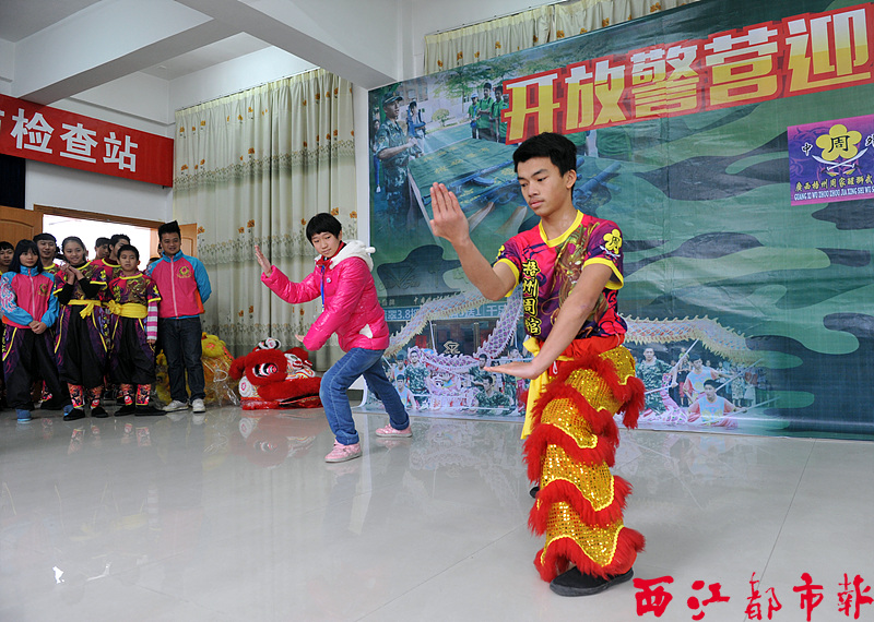 ????舞龍舞獅是梧州邊檢站特色警營文化中的一種,小記者學員們通過一個小小的“新聞發(fā)布會”,用相機將周家館醒獅團與梧州邊檢站交接旗幟的瞬間定格,了解武警官兵傳承“第二故鄉(xiāng)”傳統(tǒng)文化的故事。鑼鼓敲起,醒獅躍動,小記者學員們看得直鼓掌。隨后,醒獅團的武術(shù)老師“拳拳生風”,一連帶來兩套拳術(shù)讓小記者學員們更為興奮,邊檢官兵更協(xié)助武術(shù)老師,對小記者學員們觀摩學習的動作進行糾正。