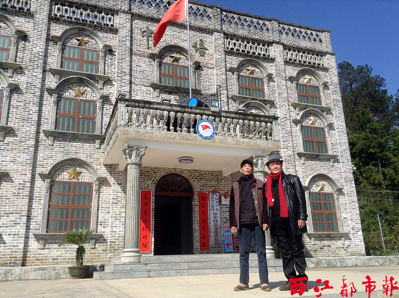 趙孚寧和31年前的救命恩人范榮光重聚,兩人在相聚的地點蒼梧縣石橋鎮培中村村委辦公樓前合影留念。朱卓錦/攝