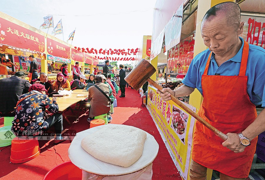 ????③2月10日,南寧廟會(huì)上師傅打著年糕,讓游人分享濃濃的年味兒。 記者 周 軍/攝