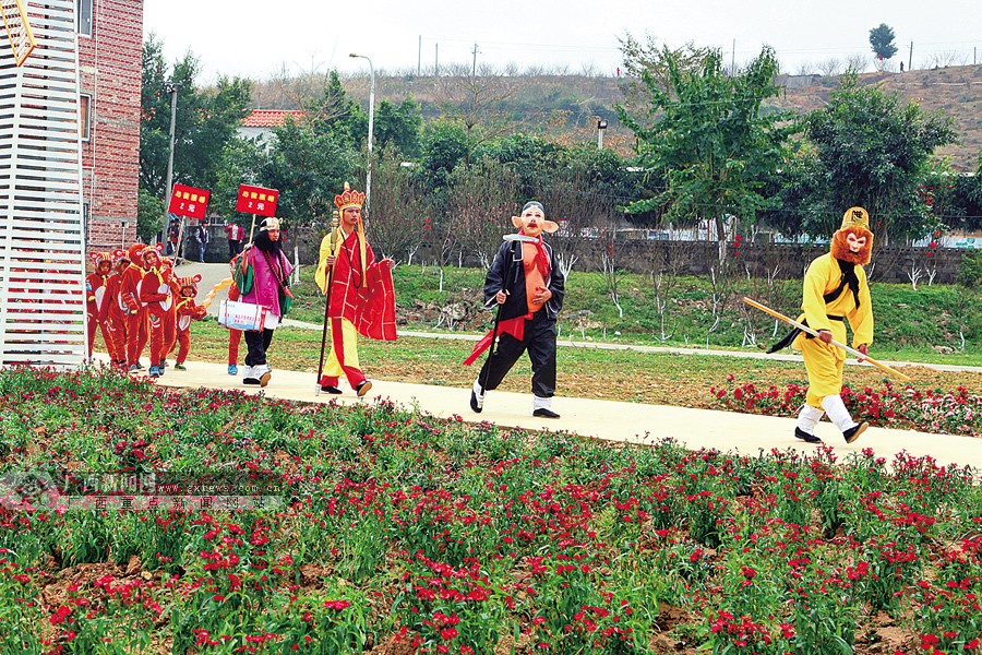 ??? 2月11日,在蒼梧縣仙跡桃花島景區(qū),裝扮成孫悟空、豬八戒、唐僧、沙和尚造型的西游迎春隊(duì)伍受到游客矚目。春節(jié)期間,該景區(qū)舉辦首屆桃花節(jié),吸引了數(shù)萬人前來觀光游玩。黎杰源/攝