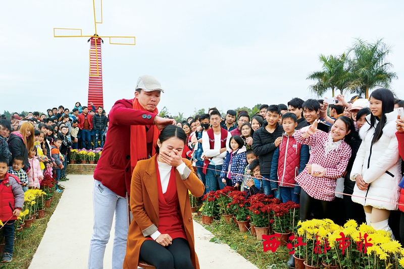 ????2月14日是西方情人節,在梧州市蒼梧縣梨埠鎮沙地村古殿桃花島景區,舉行了桃花情人節相親會,逾百名青年男女參與活動。活動中,男女雙方通過互動游戲和美容表演,以桃花為媒,了解和尋找心儀的另一半。