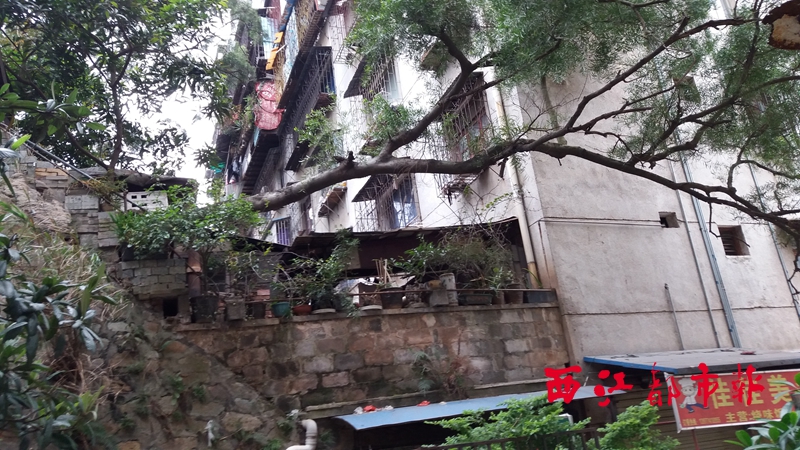 ??? 西江都市報訊(記者 紀榮蘭 通訊員 梁月芬)由于前段時間連續陰雨天氣的緣故,富民三路71-4號居民樓后面坡上的一棵大樹出現嚴重往下掉的情況,樹身一下子從原來的高度下降了一米多。如今,這棵大樹的整個樹身幾乎都橫在了小區唯一的出入通道上方。因此,怎樣處理這棵搖搖欲墜的大樹成了小區居民的煩心事。