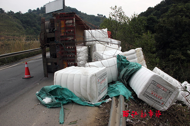 據發生事故的貨車司機介紹,他們是從福建運載著38噸化纖棉前往廣西桂平,行駛到該路段時,由于彎急加上車速過快,導致車輛失衡發生側翻,車上38噸化纖棉大部分都滾下了山谷。截止2月19日14時30分,貨物被吊起并安全轉運,事故路段恢復全線暢通。