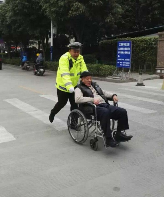 時(shí)間回到今年2月15日早上8時(shí),朱杰像往常一樣,在迎賓路一帶值勤疏導(dǎo)交通。隨著早高峰的來(lái)臨,迎賓路逐漸繁忙起來(lái),車(chē)輛來(lái)來(lái)往往。這時(shí),一位坐著輪椅的老人出現(xiàn)在街道上,由于無(wú)人陪伴,這位老人的前進(jìn)速度異常緩慢。只見(jiàn)他雙手費(fèi)力地轉(zhuǎn)動(dòng)著輪子,每當(dāng)遇上斜坡時(shí)還要伸出雙腳踩在地面上借力前進(jìn)。