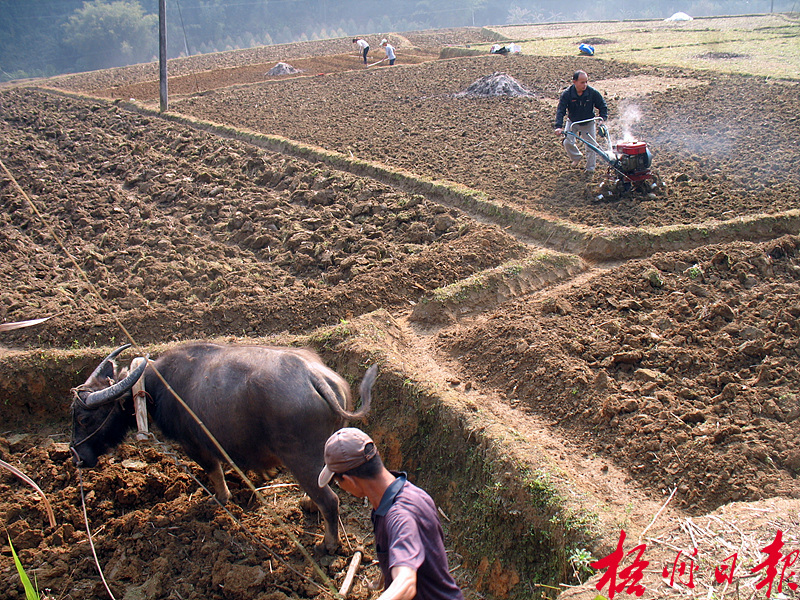 ????當日清晨,濃霧籠罩,該村公腩自然村40多戶農戶家家出動,有的拿著鋤頭、鐵鍬,有的擔著農家肥,脫鞋挽褲下田平整、分畦、起壟……只見十多臺拖拉機活躍于田間,五頭耕牛也不甘落后,賣力耕作,現代與傳統的耕作方式相映成趣。