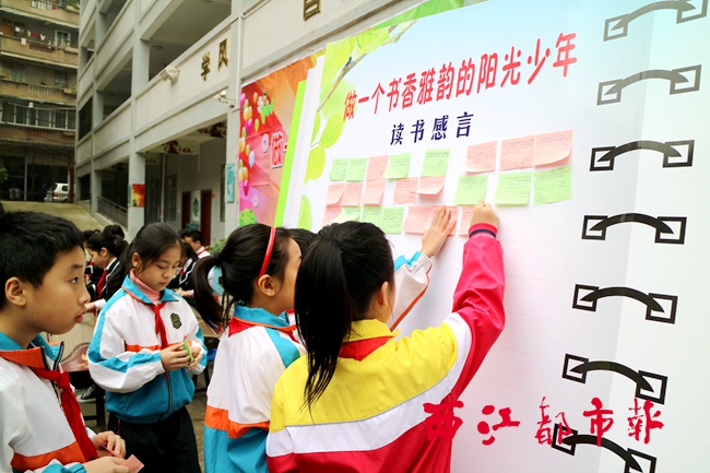 在北環路小學的開學典禮上,學生們貼出寒假期間閱讀的心得體會,與他人分享。 (通訊員 曾綺莉/攝)
