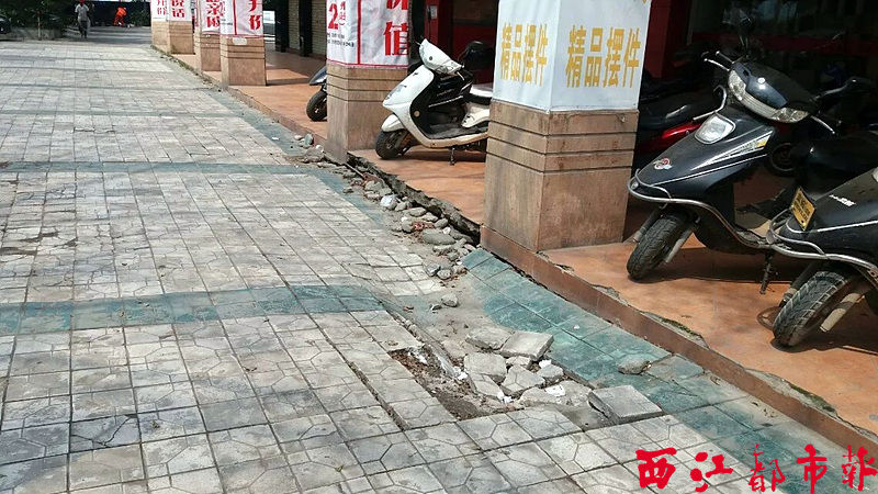 商鋪對出的路面已出現塌陷的情況,原來鋪砌的瓷磚被壓碎,路面整塊凹陷下去形成一個坑。 紀榮蘭/攝