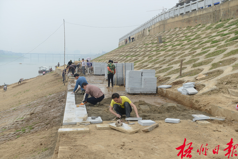 ??? 3月4日,在西堤三路防洪堤外,工人們正鋪裝磚塊。????目前,河西防洪堤岸坡整治及景觀提升工程國龍大酒店對開岸坡的一級、二級、三級親水平臺已基本完成水泥路面鋪設,部分石欄桿已砌建完畢,正抓緊鋪裝地磚、修整斜坡等施工,力爭在今年汛期前完成既定任務。?李鴻榮?攝
