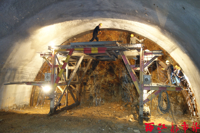 近日,施工人員正在梧州市環城高速公路下潭隧道已開挖的作業面上焊接鋼拱架,對隧道進行初期支護以承接山體的壓力。
