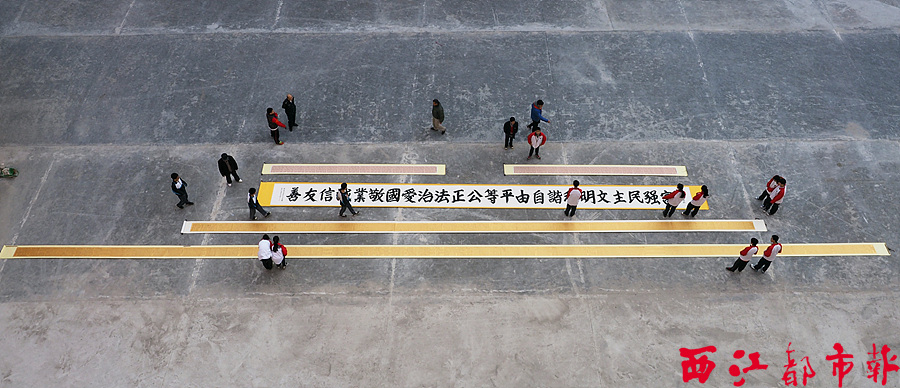 ????近日,在梧州市第五中學(xué)的操場上,一幅長28.5米、寬0.4米的小楷特長卷《壇經(jīng)》,一幅長13.8米、寬1米的正楷大字書寫的長卷《社會主義核心價值觀》,吸引了眾多師生的眼球。面對較為罕見的特長卷書法作品,現(xiàn)場觀者紛紛贊嘆不已。