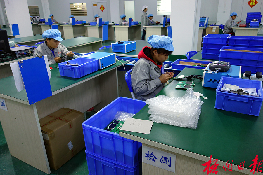 ????3月9日,在梧州工業園區金正原電子科技有限公司檢測車間,工人正在組裝、檢測汽車專用測試儀器。