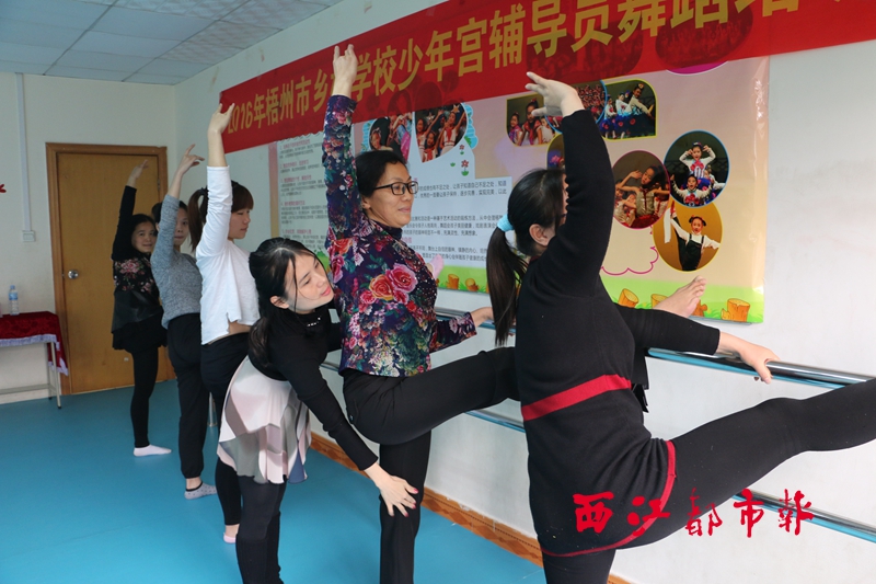 ??? 3月15日,參加培訓的人員正在梧州市青少年宮舞蹈教師的指導下進行形體練習。