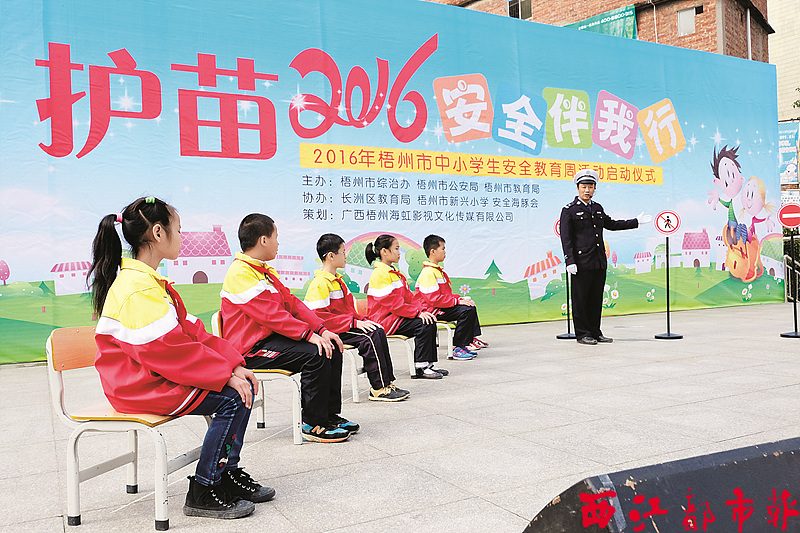 ????西江都市報訊(記者 萬立平 通訊員 蘇志寧 曾亮 )3月25日,由梧州市綜治辦、梧州市公安局、梧州市教育局主辦,長洲區教育局、新興小學協辦的2016年梧州市中小學生安全教育周活動啟動儀式在新興小學舉行。